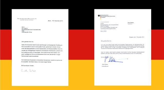 12月7日,德意志聯邦共和國駐上海總領事館總領事羅騰先生向我校蔡敬民書記轉呈了德國總理安格拉·默克爾的感謝信,并表示“期待能與合肥學院再次合作”。默克爾總理在感謝信中對我校在她訪問期間所作的精心安排和溫馨感人的接待表示衷心感謝,并表示:合肥學院與德國高校三十年的合作交流“又一次有力地表明了,幾十年來中國和德國以多姿多彩的方式進行了密切的伙伴合作”。“我們很愿意進一步擴大貴校與德國高校間現有的合作,在此方面,我樂意成為你們的密切合作伙伴”。