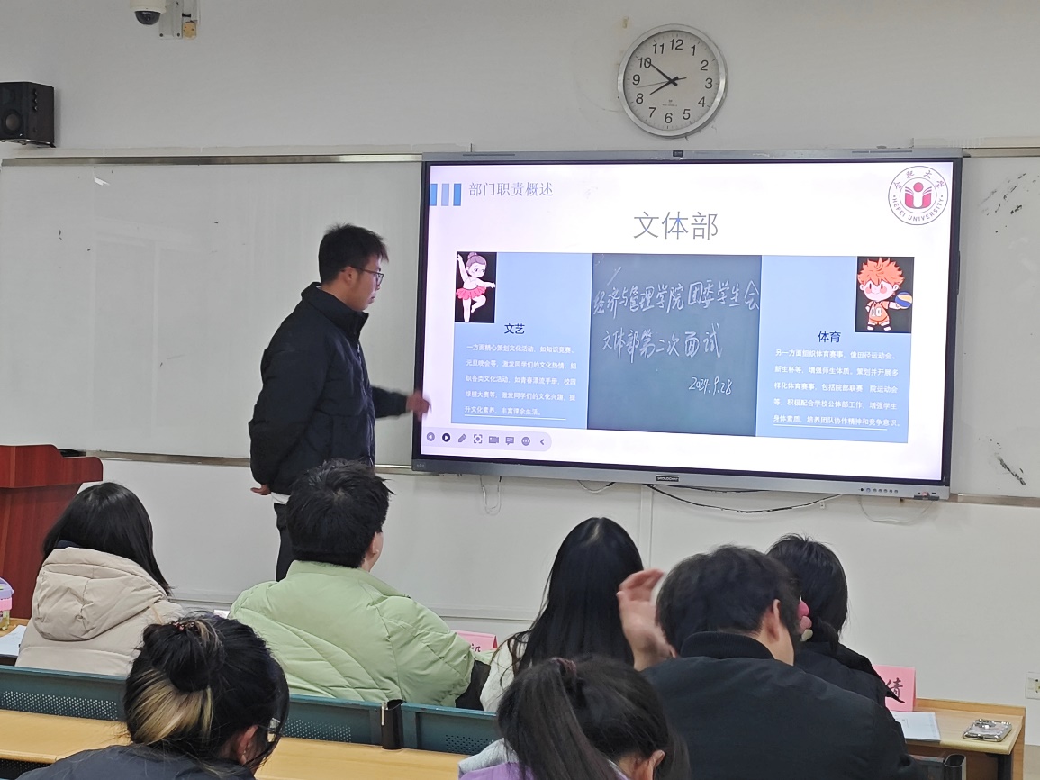 202515,經濟與管理學院團委學生會述職大會在一期4-104進行。院學生會主席團及各部門部長級成員參加大會。