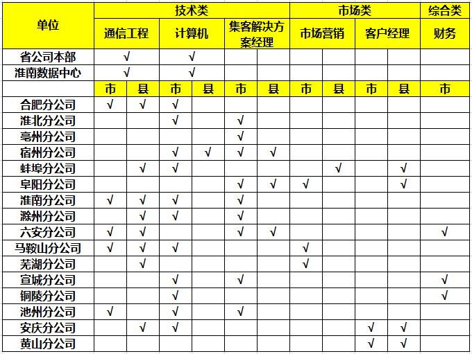 招聘職位:省、市、縣公司技術、市場、綜合類職位,具體如下:
