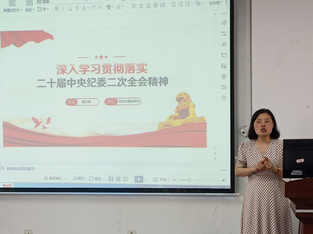 為深入開展學習貫徹習近平新時代中國特色社會主義思想主題教育,2023年5月29日,經濟與管理學院黨委副書記夏丹青以深入學習貫徹落實二十屆中央紀委二次全會精神為題,一期6棟會議室講授專題黨課學院全體紀委委員、學生黨員代表參加