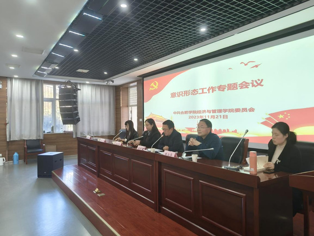 2023年11月21日下午,經濟與管理學院于一期6報告廳召開意識形態工作專題會議。本次會議由經濟與管理學院黨委書記倪澤強主持,經濟與管理學院院長陳江華,黨委副書記、副院長吳悅,黨委副書記夏丹青,副院長于娜,全體教職工出席會議。