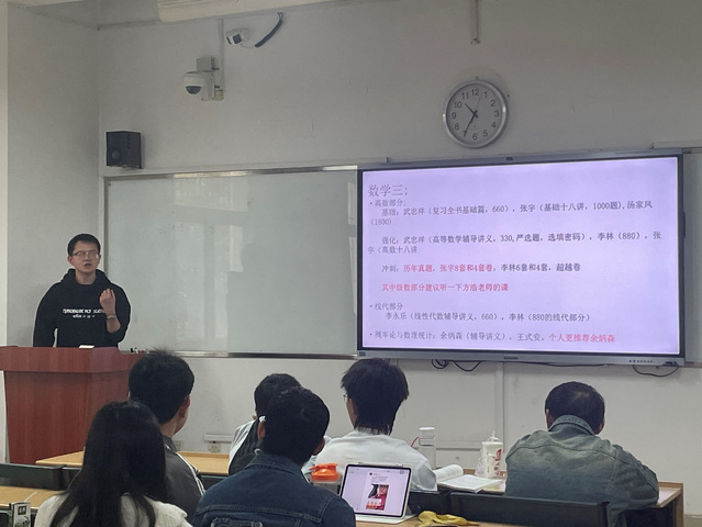 為提高經(jīng)濟(jì)工程專業(yè)學(xué)生考研及就業(yè)熱情,營(yíng)造積極向上的良好學(xué)風(fēng),4月10日上午,經(jīng)濟(jì)工程專業(yè)考研及就業(yè)交流會(huì)在一期4棟104教室順利開展。本次交流會(huì)邀請(qǐng)了經(jīng)管學(xué)院20級(jí)畢業(yè)生代表張忠兵、唐肖鋒到會(huì)分享,會(huì)議由輔導(dǎo)員于昊老師主持,21級(jí)經(jīng)濟(jì)工程全體同學(xué)參會(huì)。 會(huì)上,于老師簡(jiǎn)要介紹了經(jīng)管學(xué)院20級(jí)整體考研及就業(yè)情況,深入分析了當(dāng)下的考研和就業(yè)形勢(shì),鼓勵(lì)同學(xué)們積極進(jìn)取、努力拼搏,虛心接受學(xué)長(zhǎng)的建議。隨后,張忠兵、唐肖鋒分別為同學(xué)們講解了在備考期間應(yīng)該注意的問題,包括考研各科的復(fù)習(xí)方法、備考計(jì)劃、院校選擇、作息時(shí)間安排等,同時(shí)建議考研、考公的同學(xué)可以在下學(xué)期積極參加校園招聘會(huì),在備考的同時(shí)可先與意向單位簽約保底,緩解心理壓力。在現(xiàn)場(chǎng)提問環(huán)節(jié),張忠兵、唐肖鋒悉心解答了同學(xué)們提出的各種問題,并給出了有針對(duì)性的參考建議,進(jìn)一步堅(jiān)定了在場(chǎng)同學(xué)們的備考信心。