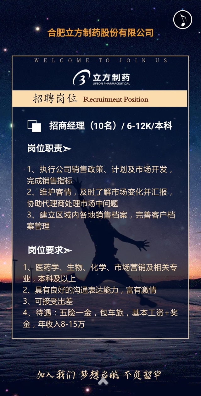 | 招聘信息 招聘單位:合肥立方制藥股份有限公司 招聘崗位:招商經理 專業需求:市場營銷相關專業 聯系電話:18055112248 0551-65321427(昂海蓉)