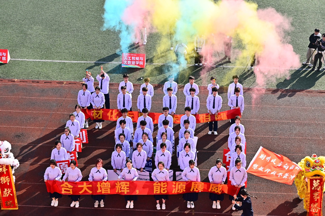 運(yùn)動(dòng)會(huì)開幕式如絢麗畫卷展開。國(guó)旗隊(duì)率先亮相,邁著磅礴步伐,手舉鋼槍,莊重入場(chǎng)。隨后各學(xué)院方陣在激昂音樂(lè)中依次登場(chǎng),同學(xué)們憑借想象力與創(chuàng)造力,以獨(dú)特隊(duì)形、服裝和道具展示班級(jí)風(fēng)采。學(xué)生們神采奕奕、精神飽滿,邁著整齊步伐,喊著響亮口號(hào),向主席臺(tái)走去接受檢閱。其中,材化學(xué)院的展示閃耀登場(chǎng),剎那間便贏得了在場(chǎng)觀眾的齊聲歡呼。校徽和院徽的轉(zhuǎn)變過(guò)程宛如一場(chǎng)奇妙無(wú)比的視覺盛宴,而當(dāng)彩色煙霧噴射而出的那一瞬間,整個(gè)場(chǎng)景更是被推向了極致的高潮。這一精彩絕倫的呈現(xiàn),不僅僅展現(xiàn)了材化院的非凡創(chuàng)造力和獨(dú)特魅力,更是在觀眾們的心中留下了難以磨滅的深刻印記,成為那個(gè)時(shí)刻最為耀眼璀璨的存在。他們的精彩展示,不但彰顯出蓬勃向上、活力四射的精神風(fēng)貌,更洋溢著對(duì)青春的熾熱熱忱、對(duì)運(yùn)動(dòng)的執(zhí)著不懈追求。