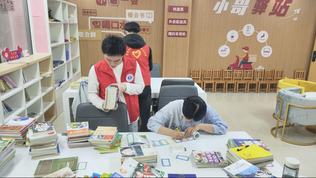 首先志愿者們在朝霞社區樓下進行集合簽到,在朝霞社區工作人員的指引下對新購置的圖書進行貼書簽并整理。志愿者們給每本圖書貼上書簽,書簽內容包括圖書類別和編號等關鍵信息。同時,他們將圖書按類別整齊擺放在書架上,細心地把兒童讀物放低層、成人書籍按類型放高層合適位置,使圖書管理更有序,為居民借閱提供便利。