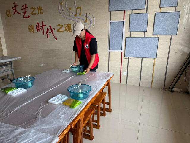 首先,志愿者們?cè)诔?span style="font-family:楷體, 楷體_gb2312, simkai;font-size:20px;">居委會(huì)教室內(nèi)準(zhǔn)備著活動(dòng)所需要用到的物品,例如橡皮泥,制作工具,盆子等,同時(shí)為避免環(huán)境臟亂,幫活動(dòng)場(chǎng)所的桌子鋪好了桌布,為本次活動(dòng)順利進(jìn)行提供了良好的開場(chǎng)基礎(chǔ)。
