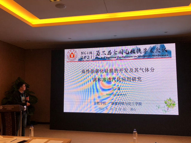 會議期間,10月24日上午,能源材料與化工學(xué)院青年教師王青以“高性能碳化硅膜的開發(fā)及其氣體分離和滲透汽化應(yīng)用研究”為題,在黃山市屯溪區(qū)會議酒店新安江大廳面向全體與會代表做20分鐘的口頭報告,報告現(xiàn)場氣氛熱烈,專家點評、聽眾與報告人問答等等互動環(huán)節(jié)引來教師和學(xué)生的陣陣熱烈掌聲。