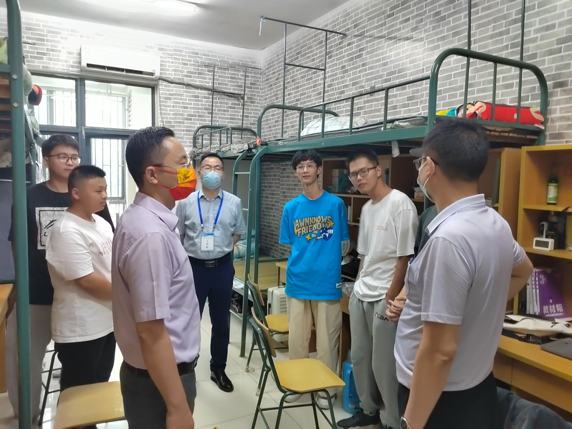 走訪中,學院領導親切的詢問各位新生都來自哪里,囑咐新生們要盡快適應集體生活,提醒同學們要按時參加晚上的班會,同時強調在疫情防控常態化期間,要高度重視宿舍的安全和衛生,勤開窗通風,保持宿舍干凈整潔,做好個人衛生防護,戴好口罩,堅持每日今日校園打卡,完成三天兩檢。同時,鼓勵同學們養成良好的學習、生活習慣,明確學習目標,以良好的精神面貌開啟自己的大學生活。