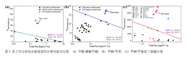 高效分離有機溶劑是化工領域追求的重要目標,而當前有機溶劑的分離主要依賴于高能耗的精餾。在碳達峰、碳中和的“雙碳”發展趨勢下, 發展低能耗、環境友好的膜分離技術具有十分重要的意義。該研究通過聚碳硅烷低溫交聯制備亞納米多孔碳化硅膜用于有機溶劑體系分離,并揭示了交聯和熱解溫度對碳化硅膜的孔徑和表面性質的影響,氣體分離屬性與液體分離性能的相關性(即基于氣體分離對液體滲透汽化分離性能的預測)。實驗表明,膜的分離性能達到了該領域的領先水平(圖1),具有良好的工業化應用前景。