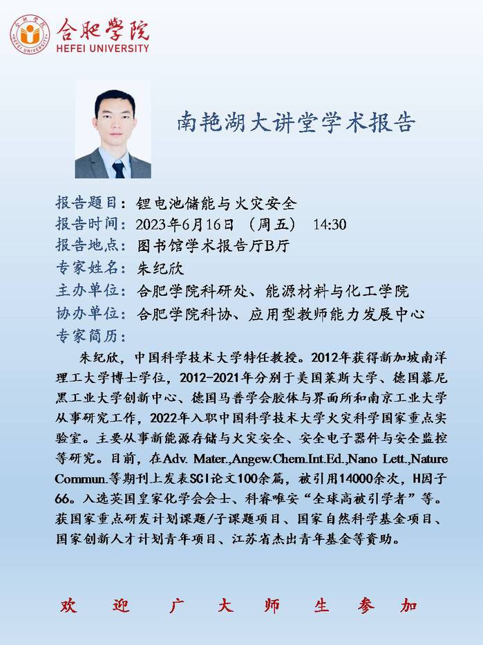 【學術報告預告】本周五下午舉行中國科學技術大學朱紀欣教授題為“鋰電池儲能與火災安全”學術報告(材化學院承辦)