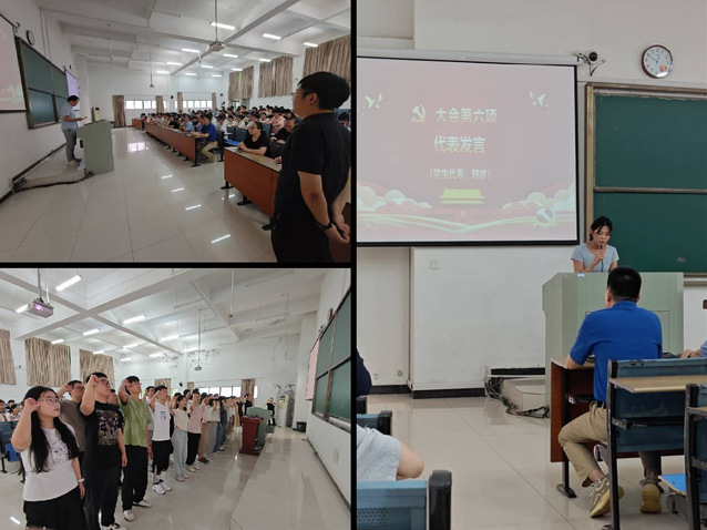 “我志愿加入中國共產黨,擁護黨的綱領,遵守黨的章程……”,在大會現場舉行了新黨員入黨宣誓儀式。2024年新發展的25名學生黨員舉起右拳,面對黨旗莊嚴宣誓,許下為共產主義奮斗終身的錚錚誓言。