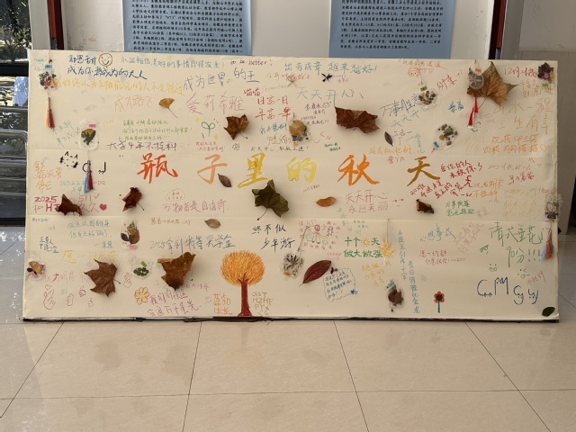 下午兩點(diǎn),活動(dòng)準(zhǔn)時(shí)開始,同學(xué)們有序領(lǐng)取瓶罐狀的透明書簽,尋找有關(guān)秋的物品,裝飾瓶狀書簽并將其掛在樹間捆綁的麻繩上。同時(shí),同學(xué)們在展板上盡情創(chuàng)作,粘貼樹葉、書簽,留下愿望和感想,共同創(chuàng)作了一幅秋日畫卷。