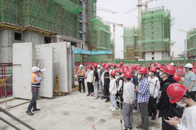 本次活動得到合肥市建設工程檢測中心有限責任公司、長豐縣質監站大力支持,中建八局錦繡鳳湖二期項目部精心組織,安排相關技術人員帶領師生進行場地參觀交流。技術人員向同學們重點介紹了裝配式結構構件的組成、分類、施工流程及套筒灌漿控制要點等,同時結合現場疊合板、預制樓梯、ALC板等構件闡述其施工要點。通過與技術人員深入交流,同學們對裝配式建筑工程施工過程有了更清晰的認識,收獲頗豐。