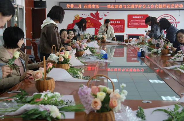 三月春風,百花盛開。為慶祝國際三八婦女節,豐富業余生活,城市建設與交通與交通學院于41棟305會議室舉辦“芳菲三月,花漾生活”花藝活動,學院全體女教師參加。