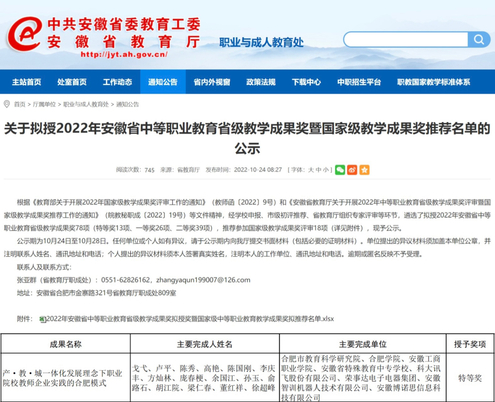 近日,安徽省2022年職業(yè)教育教育教學(xué)成果獎(jiǎng)評(píng)選結(jié)果揭曉,我校與合肥市教育科學(xué)研究院等單位聯(lián)合申報(bào)的《產(chǎn)·教·城一體化發(fā)展理念下職業(yè)院校教師企業(yè)實(shí)踐的合肥模式》成果榮獲特等獎(jiǎng),被推薦參加國(guó)家級(jí)職業(yè)教育教學(xué)成果獎(jiǎng)的評(píng)選。