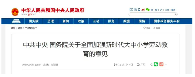 中共中央國務院關于全面加強新時代大中小學勞動教育的意見