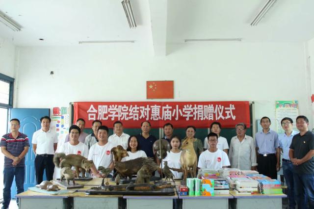 “合肥的大學(xué)給我們送來(lái)了揚(yáng)子鱷、黃鹿、豪豬,講是標(biāo)本,還有好多畫(huà)書(shū),好多籃球、羽毛球、乒乓球……”這幾天,泗縣惠廟村的孩子們歡喜雀躍,奔走相告,原來(lái)是合肥學(xué)院教育系代表學(xué)校于本月13日到幫扶村的惠廟小學(xué)開(kāi)展了捐贈(zèng)活動(dòng)。
