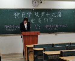 10月12日晚6點(diǎn)在善思樓B座305和307教室教育學(xué)院舉行辯論賽初賽。 本次比賽共有四支隊(duì)伍參加,分四組兩兩進(jìn)行角逐。兩場(chǎng)比賽展開討論的辯題分別是“網(wǎng)絡(luò)匿名特性有利于不利于公眾議題”和“解決校園霸凌更應(yīng)該依靠法律手段教育手段”。 比賽開始,雙方辯手很快進(jìn)入角色,在主持人宣布完比賽規(guī)則以及注意事項(xiàng)后,雙方辯手開始了精彩的辯論。辯論中,各位辯手有序發(fā)言,雙方有來(lái)有回,層層遞進(jìn),對(duì)辯題進(jìn)行了深刻的探討,場(chǎng)內(nèi)氛圍熱烈。最后環(huán)節(jié),評(píng)委對(duì)選手的表現(xiàn)進(jìn)行了中肯的評(píng)價(jià)以及意見(jiàn)建議,各位選手都表示受益匪淺。