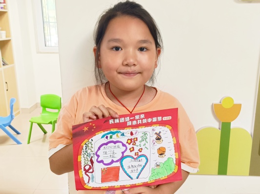 “家”的文化只有在分享與傳承中才能歷久彌新。志愿者不僅帶領孩子們學習了各民族的文化,還鼓勵孩子們分享自己民族的故事與習俗。孩子應當在生活的點滴小事中發現并了解自己獨特的家鄉文化,從漢字墨香溫存的一筆一畫中體悟時代傳承中的表達。此次課程中張曉潔讓孩子們圍繞“民族團結一家親,同心共筑中國夢”這一主題繪制手抄報,孩子們都深刻感悟了此次課程所學,手抄報或筆觸細膩,或圖文并茂。孩子們還積極分享了自己的手抄報作品,用樸素的語言表述了自己的創作思路,流露出對中華民族一家親、共同鑄就中國夢的真摯期愿。