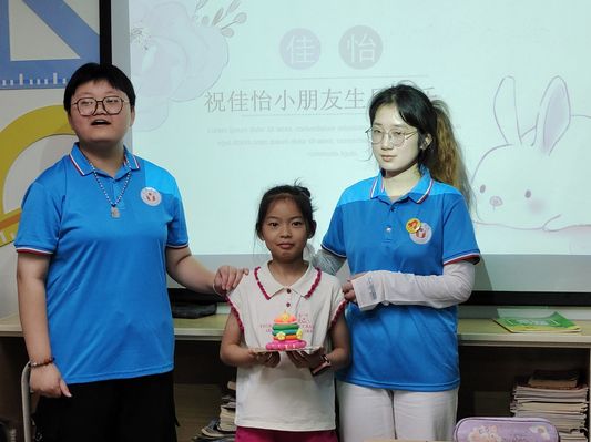 按下的快門合照也折射出孩子們五彩斑斕的記憶。團隊成員王欣悅放映了她為小朋友制作的生日祝福幻燈片,并且和在場的其他成員一起帶領著小朋友共同為沈佳怡歌唱《祝你生日快樂》。教室溫馨的氛圍在音符的跳動中更是添上了一抹活躍的色彩。團隊成員還為佳怡小朋友送上了小零食,表達了真摯的祝福,希望她能夠健康快樂地成長?;顒拥淖詈螅驹刚邆兣c小朋友一同合影留念,記錄下這個美好的瞬間。