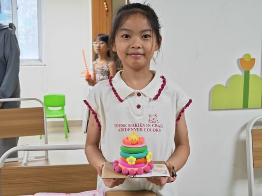 7月5日,合肥學院教育學院“七彩童年,‘育’你相伴”三下鄉社會實踐團隊于合肥市濱湖和園社區開展暑期“三下鄉”社會實踐活動。團隊成員在先前的交流中得知今天是一位小朋友的生日,于是大家決定為她準備一個特別的慶生計劃,希望能夠給她留下一段美好的回憶。 生日,一直以來被我們賦予別樣的意義:從生命旅途的起點到“一歲一禮,一寸歡喜”的儀式感,在我們成長的過程中,總會有那么幾次難忘的生日回憶,這些回憶共同構成了我們的珍貴記憶寶庫。 團隊成員為孩子做的彩色“黏土蛋糕”點綴了這個特別的日子。慶生活動的開始,團隊成員朱思宇和周琴就拿出了提前用超輕粘土精心制作好的手工彩色蛋糕。在成員出色技藝下,這個蛋糕被制作得更為精致巧妙。她們還別出心裁地在蛋糕的最上方捏了一個小朋友喜歡的“蛋仔”玩偶,使得整個粘土蛋糕看起來更加靈動且充滿了人情味。