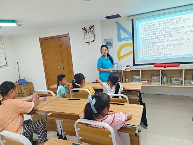 健康成長的第一要素是學會培養合理的飲食習慣,因此,在課程開始之前,侯鑫宇老師首先對孩子們的飲食狀況進行了調查。調查顯示大部分的兒童喜歡吃油炸類,膨化類等食品,造成這些不健康的飲食習慣的主要原因是兒童對營養知識的缺乏以及父母對兒童飲食健康習慣的忽視。在此基礎上,侯鑫宇老師先向孩子們介紹了我國九類垃圾食品的種類以及危害。臺下的孩子們一邊跟著老師念著垃圾食品的危害,一邊小聲地說著下次一定少吃垃圾食品。“那老師,哪些食品是健康的呢?”“我們要多吃綠色的蔬菜與新鮮的水果,每天補充蛋白質,注意飲食的多樣性,這樣身體才會健康。”
