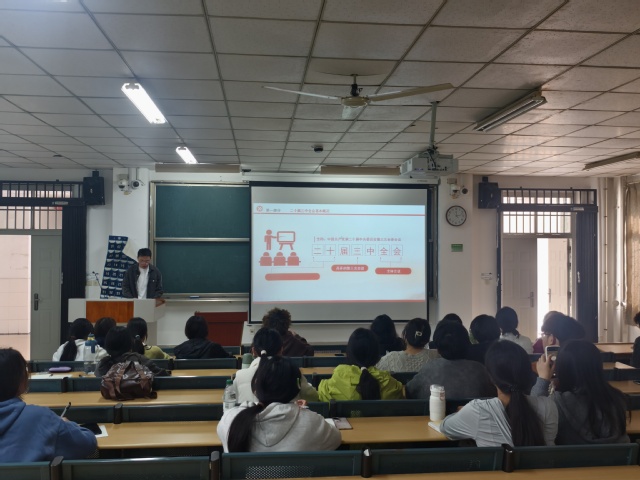 11月14日,合肥大學旅游與會展學院第一期青年馬克思主義者培訓工程第二區博學樓一樓107多媒體教室順利開講。本次課程由合肥大學學習宣傳貫徹黨的二十屆三中全會精神宣講團成員、合肥大學校學生會主席唐宇飛主講、院學生會組織部闞欣悅主持、全體青馬班學員參與學習。