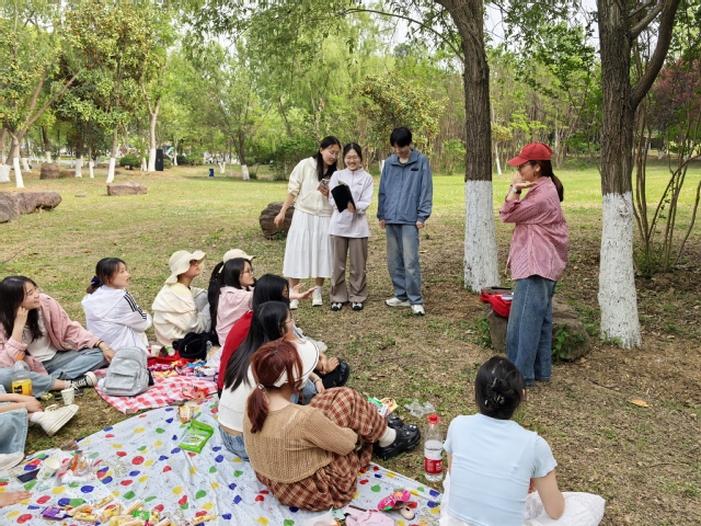 活動(dòng)伊始,主講人李湘圍繞谷雨節(jié)氣的歷史淵源、民俗習(xí)慣及文化內(nèi)涵展開生動(dòng)講解,并組織趣味知識(shí)競答,同學(xué)們踴躍搶答,現(xiàn)場氣氛熱烈。隨后,主持人談成文、歐陽雯鳳帶領(lǐng)大家開展妙趣橫生的團(tuán)隊(duì)協(xié)作挑戰(zhàn)。經(jīng)過“數(shù)字炸彈”“一人喝醋”“你畫我猜”等游戲?qū)⒒顒?dòng)推向高潮。這些精心設(shè)計(jì)的游戲不僅考驗(yàn)了團(tuán)隊(duì)協(xié)作能力,更在輕松愉快的氛圍中拉近了同學(xué)們的距離。最后,全體成員在湖畔草坪共享春日野餐,感受著集體的溫暖與青春的活力。