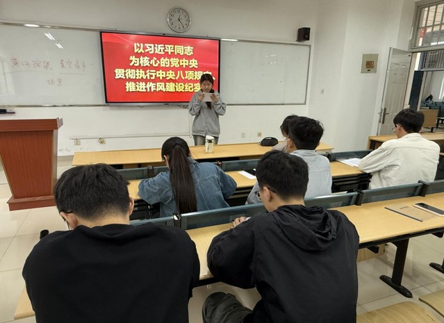 5月9日,旅游與會展學院學生第二黨支部于博學樓A座104教室舉辦深入貫徹中央八項規定精神學習教育專題讀書分享會。活動由歐陽雯鳳同志主持,支部黨員與積極分子踴躍參與,聚焦中央八項規定精神及其實施細則,深刻感悟新時代加強黨的作風建設的重大意義。