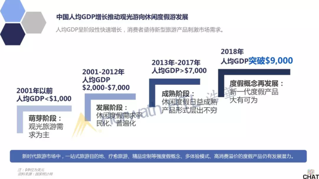中國國內旅游呈現出蓬勃發展的態勢,近8年的旅游人次及旅游收入均以較為平穩的增速保持增長,增幅均在10%以上。隨著國民經濟的發展,中國國內旅游發展也經歷了不同的階段,從萌芽階段過渡到發展、成熟階段,直至目前度假概念再發展階段,人們對于新時代的旅游市場中的度假產品有了更多的訴求,因此未來一站式的旅游目的地、療愈旅游、精品定制游等強度假模式、多體驗模式、高消費溢價類的度假產品仍具有較大的發展潛力。