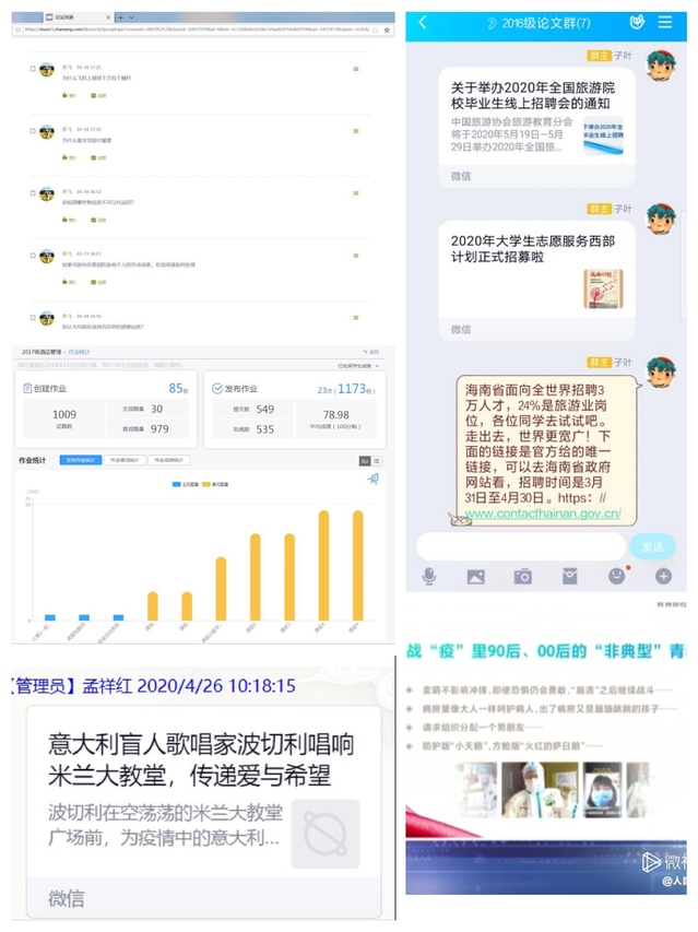 首先,積極參加線上教學(xué)培訓(xùn),積極探索與線上教學(xué)契合的課程內(nèi)容設(shè)置、教學(xué)方法設(shè)計(jì)、教學(xué)環(huán)節(jié)安排等。教師們把專業(yè)教學(xué)與抗“疫”斗爭結(jié)合起來,將課程思政融入課堂,鼓勵學(xué)生堅(jiān)定戰(zhàn)勝疫情的信心與決心。孟祥紅老師結(jié)合目前疫情對全世界旅游業(yè)的影響、世界名勝的現(xiàn)狀激發(fā)學(xué)生的好奇心和對美好事物的渴望,高騰老師在教學(xué)內(nèi)容中增加新冠肺炎疫情對文旅企業(yè)的影響鼓勵學(xué)生將課程知識應(yīng)用到幫助文旅企業(yè)復(fù)蘇的實(shí)踐中