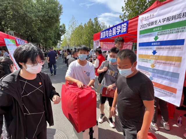 迎新活動伊始,歡樂激動的氣氛,早已洋溢在迎新地點周圍。志愿者們分成報道組和接待組兩組。烈日驕陽下,報道組的志愿者們熱情耐心地引導新生按要求填寫入學報到信息并解答新生和家長疑惑。學校領導和旅游與會展學院的領導們也前來關心迎新工作的進程。緊接著,接待組的志愿者們帶領新生前往宿舍,搬運行李箱,提包裹袋,噓寒問暖。最后,志愿者們離開之際細心叮囑新生入學需要注意的事項。一天下來,迎新工作如火如荼地順利進行,志愿者們不停地穿梭于各個區域,到處都是忙碌的身影,但現場秩序卻仍然有條不紊。