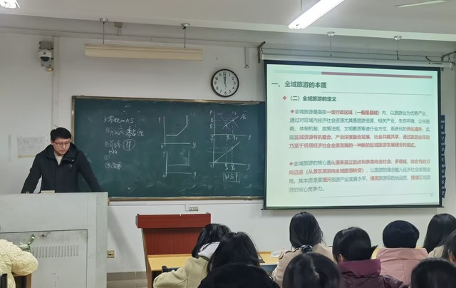 講座上,張業(yè)臣博士首先從全域旅游的概念與本質(zhì)出發(fā),結(jié)合自身研究經(jīng)歷與旅游界對(duì)于“全域旅游”態(tài)度轉(zhuǎn)變的過程,剖析新時(shí)代中國(guó)旅游業(yè)在社會(huì)經(jīng)濟(jì)發(fā)展大背景、大環(huán)境下的新變化,強(qiáng)調(diào)全域旅游作為一種理念與發(fā)展模式的必要性與創(chuàng)新性,并對(duì)于目前發(fā)展過程中重“牌”輕“路”、重“創(chuàng)”輕“治”、重“行”輕“知”、重“縱”輕“橫”的現(xiàn)狀進(jìn)行反思,以此提出未來全域旅游的發(fā)展新方向。接著,張業(yè)臣博士通過大量案例,針對(duì)全域旅游發(fā)展實(shí)踐的基本路徑進(jìn)行詳細(xì)解讀,深刻講解了打造全域旅游的方法步驟,闡述了目前中國(guó)旅游發(fā)展的制約因素,內(nèi)涵豐富、精辟深刻。講座最后,張業(yè)臣博士帶領(lǐng)同學(xué)們就安徽省“十四五”旅游發(fā)展規(guī)劃進(jìn)行思考,他提到,全域旅游理念的實(shí)踐更需要強(qiáng)化國(guó)際視野、國(guó)際標(biāo)準(zhǔn),推動(dòng)生態(tài)、文化、旅游、科技融合發(fā)展。