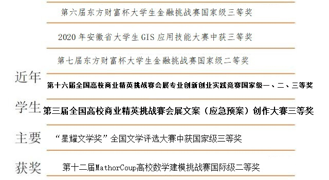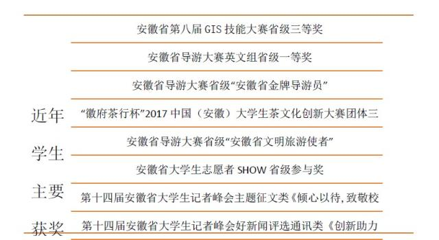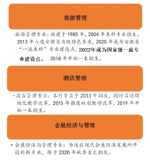 學院現有旅游管理、酒店管理、會展經濟與管理三個本科專業,其中,旅游管理專業為安徽省特色專業、安徽省“一流本科”建設專業2022年獲批國家級一流專業建設點。