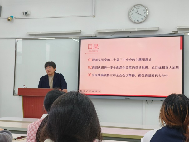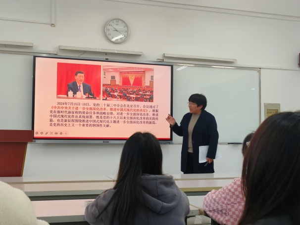 此次黨課圍繞二十屆三中全會精神,主要從三個方面開展授課:一是深刻認識黨的二十屆三中全會的主題和意義;二是深刻認識進一步全面深化改革的指導思想、總目標和重大原則;三是全面準確領悟三中全會會議精神,做優秀新時代大學生。自十一屆三中全會以來,我國改革開放事業全面發展,二十屆三中全會更是強調要“進一步全面深化改革”。同時強調“中國式現代化”的五大特點,其既有各國現代化的共同特征更有基于自己國情的中國特色。授課過程中,李秀娟通過解釋習近平總書記提出的“六個力”,即思政引領力、人才競爭力、科技支撐力、民生保障力、社會協同力、國際影響力,引領支部黨員用青春書寫華彩篇章!