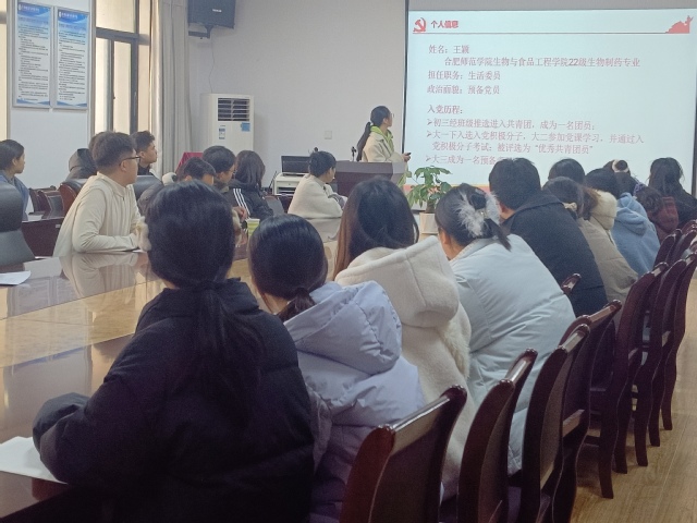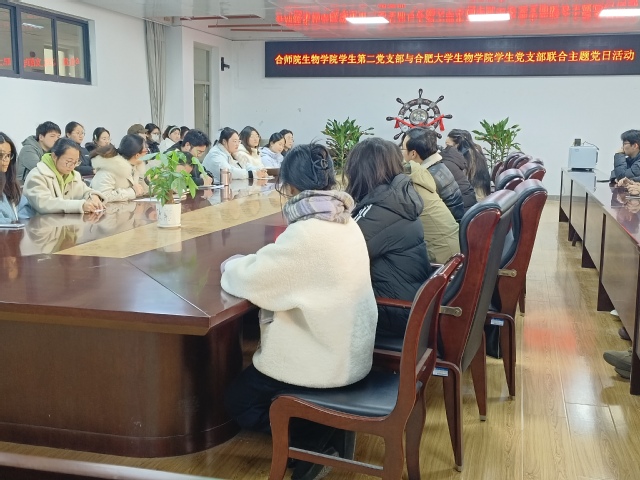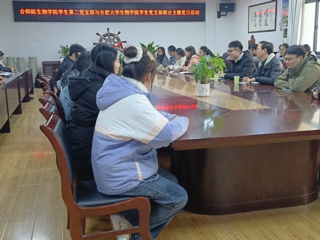 20241231日上午9點(diǎn),合肥大學(xué)生物學(xué)院學(xué)生黨支部與合肥師范學(xué)院生物學(xué)院學(xué)生第二黨支部,在合肥大學(xué)生化樓三樓會(huì)議室開(kāi)展聯(lián)合主題黨日活動(dòng)。此次活動(dòng)由合肥大學(xué)生物食品與環(huán)境學(xué)院生工系學(xué)生黨支部書記陳玲主持,食品專業(yè)學(xué)生黨支部書記趙暮雨,環(huán)工系學(xué)生黨支部書記楊林,合肥師范學(xué)院生物學(xué)院學(xué)生第二黨支部書記徐浩然,學(xué)生第一黨支部書記周其松,以及兩校部分黨員代表參加。
