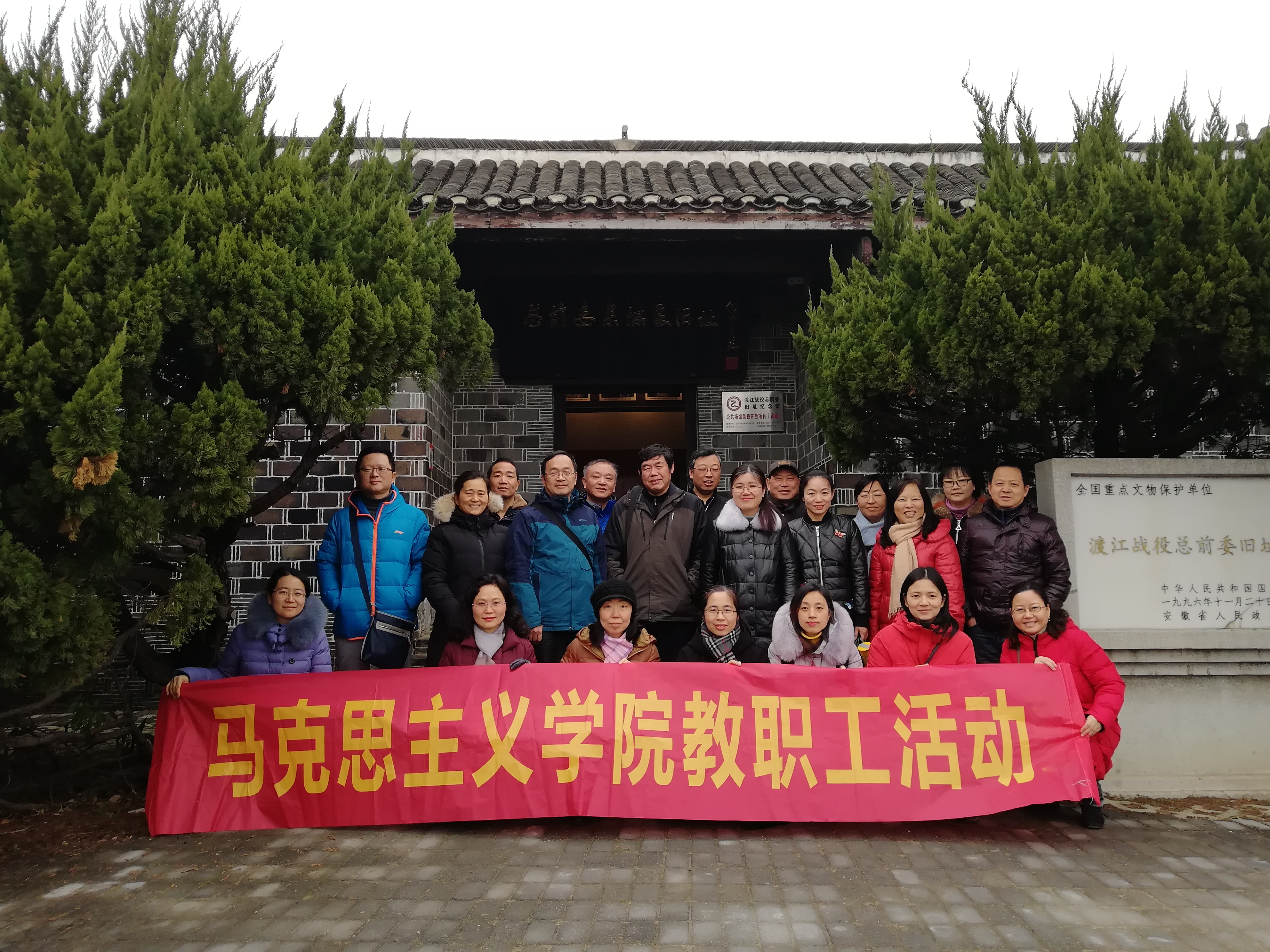 2019年1月15日上午,為豐富教職工的文化生活,增強馬克思主義學院的凝聚力,馬克思主義學院基層分工會組織全體人員到肥東瑤崗渡江戰役總前委舊址紀念館參觀學習。1996年11月20日,渡江戰役總前委舊址被國務院列為全國重點文物保護單位,紀念館分為九個部分:總前委舊址、中共中央華東局舊址、總前委參謀處舊址、機要處舊址、秘書處舊址、后勤處舊址、警衛營舊址、醫院舊址和《渡江頌》書畫展廳。紀念館現有實物、圖片(表)700余件,以及將帥題詞、書畫作品108幅,黨政領導題詞36幅。