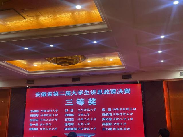 我校學子在安徽省第二屆大學生講思政課比賽決賽中取得佳績2023年12月22日,安徽省第二屆大學生講思政課決賽落下帷幕。我校徐萌萌團隊作品《新思想 新格局 新青年——建設具有強大凝聚力和引領力的社會主義意識形態》(指導教師:蘇冰,李雯雯)榮獲決賽三等獎。