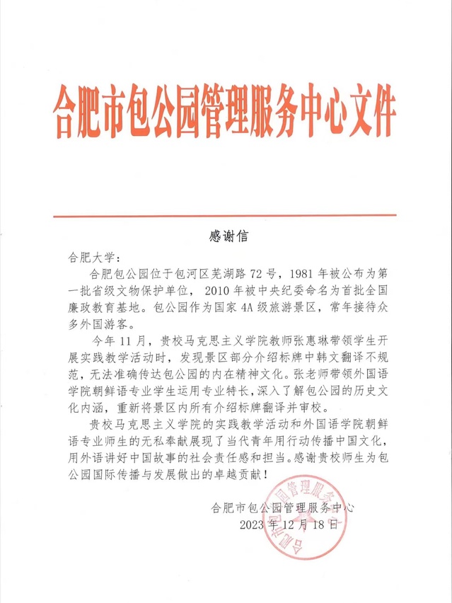 學生們通過此次活動,深刻感悟了包拯“孝忠、民本、剛正、清廉”的思想及中國傳統文化內涵,但同時發現景區部分介紹標牌外文翻譯不規范,無法準確傳達其內在的精神文化。教師在與景區管理服務中心溝通后,引導學生運用專業特長,以包公園的深厚歷史文化內涵為依托,重新將景區內所有介紹標牌翻譯并請專家審校。12月18日,合肥包公園管理服務中心向合肥大學發來感謝信,信中感謝馬克思主義學院的實踐教學活動和外國語學院朝鮮語專業師生的無私奉獻,贊揚我校師生用行動傳播中國文化,展現了當代青年用外語講好中國故事的社會責任感和擔當。