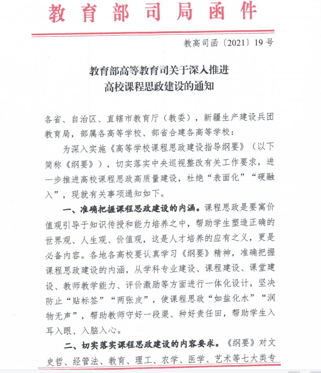 教育部高等教育司關(guān)于深入推進(jìn)高校課程思政建設(shè)的通知(教高司函〔2021〕19號(hào))