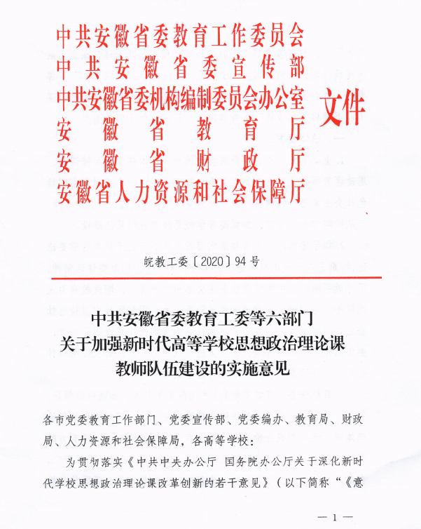 中共安徽省委教育工委等六部門關(guān)于加強(qiáng)新時代高等學(xué)校思想政治理論課教師隊伍建設(shè)的實(shí)施意見(皖教工委[2020]94號)
