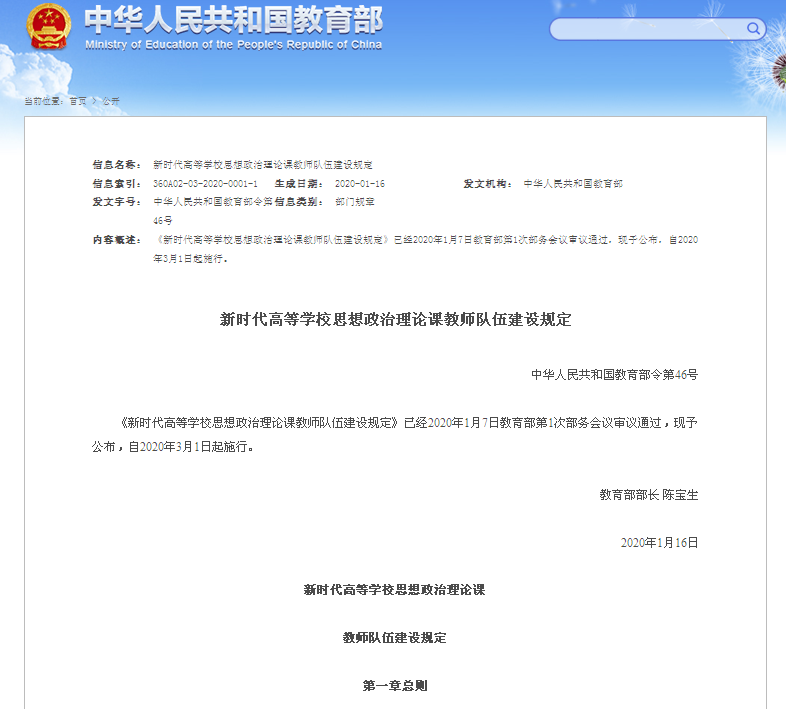 新時代高等學校思想政治理論課教師隊伍建設規定(中華人民共和國教育部令第46號)