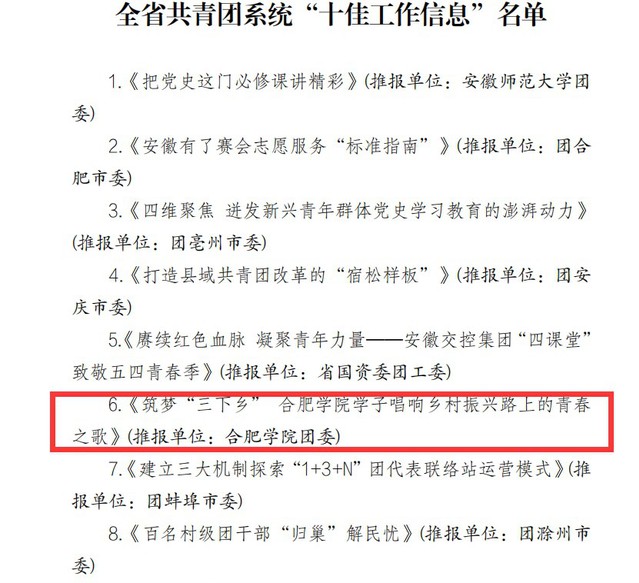 近日,由共青團安徽省委主辦的安徽共青團系統“十佳工作信息”評選結果揭曉,我校推報的作品《筑夢“三下鄉”合肥學院學子唱響鄉村振興路上的青春之歌》榮獲2021年度安徽共青團系統“十佳工作信息”。