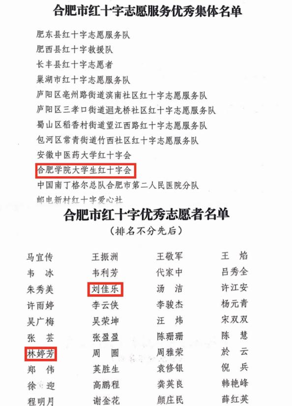 為樹立典型,進一步踐行“人道、博愛、奉獻”的紅十字精神,合肥市紅十字會通報表彰了2022年度合肥市紅十字志愿服務優秀集體及優秀志愿者,我校大學生紅十字會榮獲“合肥市紅十字志愿服務優秀集體”稱號,我校林婷芳和劉佳樂兩位同學榮獲“合肥市紅十字優秀志愿者”稱號。