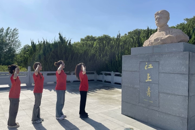 為追尋歷史記憶,汲取紅色精神力量,團隊成員跟隨村黨總支書記惠朋和駐村第一書記周全一同參觀了江上青烈士陵園。黨員代表們面對一尊半身雕像,高舉右手莊嚴宣誓:“我志愿加入中國共產黨……隨時準備為黨和人民犧牲一切,永不叛黨?!辩H鏘恢弘的誓詞,一字一句,神圣而豪邁,紅色精神深入人心。