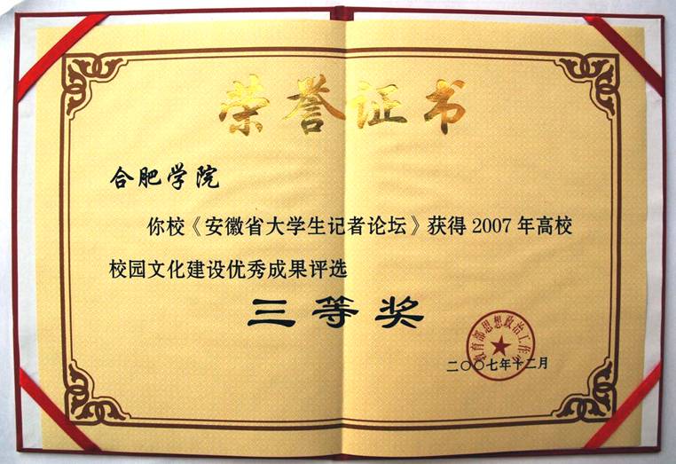 在2007年教育部思政司公布的全國高校校園文化建設(shè)優(yōu)秀成果評(píng)選中,“安徽省大學(xué)生記者論壇”獲得三等獎(jiǎng),充分展示了我省大學(xué)生的社會(huì)主人翁精神、自主創(chuàng)造性和思想層次性。