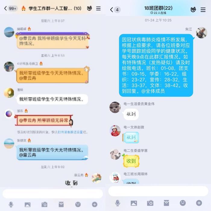 面對疫情的突然來襲,無論是各二級學院黨政負責人,還是相關學工部門工作人員、專兼職輔導員、班主任等,全體學工隊伍迅速從“假期模式”轉入“戰時狀態”。大家充分利用各類平臺和網絡資源,在教育引導學生增強自我保護意識基礎上,進行了多層次、多角度的信息摸排,精確掌握籍貫在疫情重點地區學生的身體健康狀況、所在位置與假期動向,精準摸排曾到過疫情重點地區或與相關地區春節返鄉人員接觸的學生情況。大家密切配合好、落實好學校疫情防控“日報告”、“零報告”制度,做到守土有責、守土擔責、守土盡責。在精心摸排過程中,既要求實事求是掌握情況,也把學校的關心與牽掛傳遞給相關同學,幫助他們卸下壓力重擔,積極調整狀態,以昂揚樂觀精神度過這段“非常”時期。如經濟與管理學院便建立起一支由輔導員、輔導員助理、班長、團支書、寢室長組成的信息反饋隊伍,高效準確的掌握全院3000余名學生的健康狀況;外國語學院發揮學生黨員工作站的作用,成立學生疫情防控臨時黨小組,結合本學院境外留學學生多的實際,克服點多面廣困難,對全體出國學生相關情況進行了準確掌握;先進制造工程學院、教育學院建立輔導員—學生干部與學生黨員—普通學生三級聯系制度,在各班級中實行包保負責,每位班委固定聯系部分同學,關心同學身心健康。