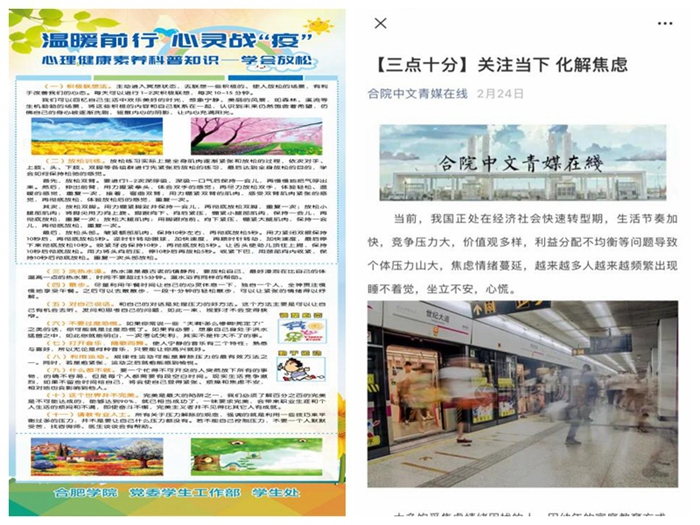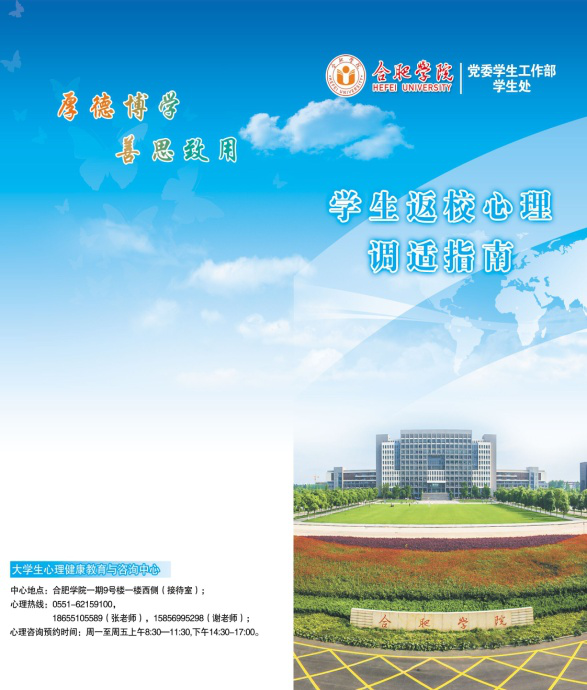 為做好返校學生的心理疏導工作,保障疫情期間在校學生的心理健康,學校周密部署,筑牢返校學生心理健康“安全網”。制作《學生返校心理調適指南》折頁,與“返校愛心包”一并發放給返校學生,制作“溫暖前行,心靈戰‘疫’”主題宣傳展架,放置于每一棟學生宿舍樓大廳,指導學生正確認識返校后的疫情形勢,介紹放松心情的常用方式和理性情緒療法,注明學校心理相關咨詢老師及聯系方式;組織我校心理健康教育與咨詢的專兼職老師和各學院輔導員老師74人參加北京師范大學馬克思主義學院舉辦的“大學生返校后的疫情防控和心理健康教育專題網絡培訓”活動,提升教師隊伍疫情防控和心理健康教育的科學化、專業化水平;聯合校團委、教育學院從5月18日開始為期一月,以線上、線下相結合的方式,開展以“云端溫暖伴你我,心靈戰疫攜手行”為主題的“5?25大學生心理健康月”活動,通過視頻、講座以及知識競賽等形式宣傳普及心理健康知識,同時開通心理咨詢熱線,將學生的困擾與咨詢老師的特長相匹配,為咨詢者安排最為適合的咨詢師,提升心理健康教育的有效性和精準度。