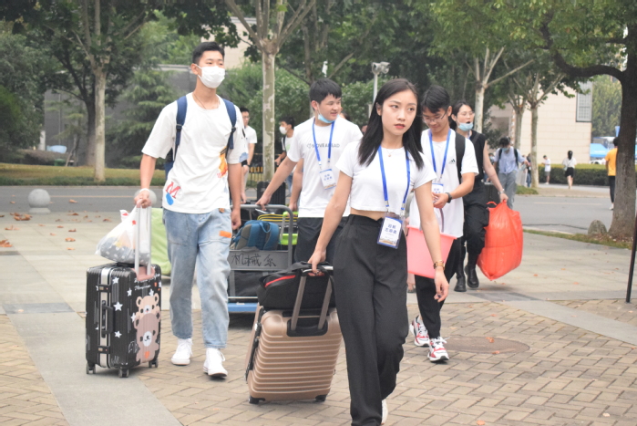 除了新生以外,迎新日的校園里還活躍著志愿者的身影,他們是合院最美的名片。“今年比較特殊,因為疫情防控的需要,家長不能陪同入校,所以我們承擔了大部分的行李搬運工作。雖然辛苦,但聽到新生們一聲聲真誠的感謝時,一切都值得了。”