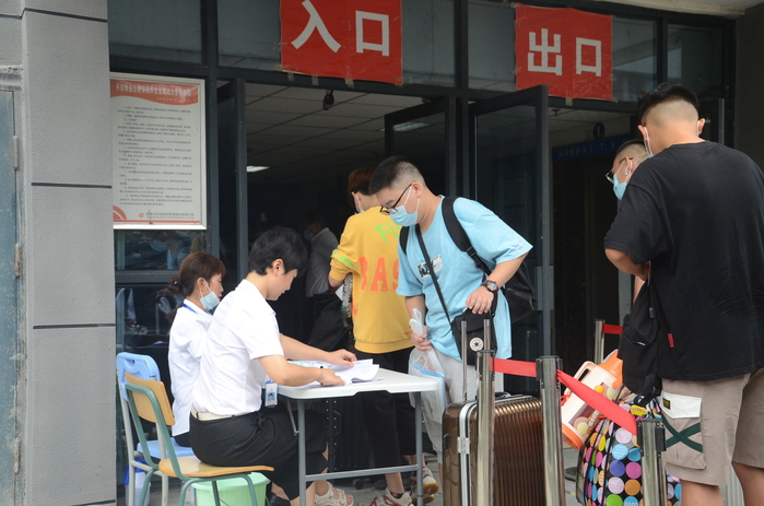 在報到現場,各學院負責迎新的工作人員提前到場做好準備,各學院更是推出了各具特色的展板,傳遞了特有的文化底蘊與精神面貌,構成了一道靚麗的風景線。前來報到的2020級新生在工作人員和志愿者的引導下,佩戴好口罩、間隔1米以上排隊,有序進行口罩更換、行李消毒、體溫檢測、“安康碼”查驗、入校資格核查。進入校園后,新生前往學院報到點報到,辦理相關入學手續并排隊依次領取軍訓服裝,隨后進入宿舍時進行二次核驗并辦理入住手續。